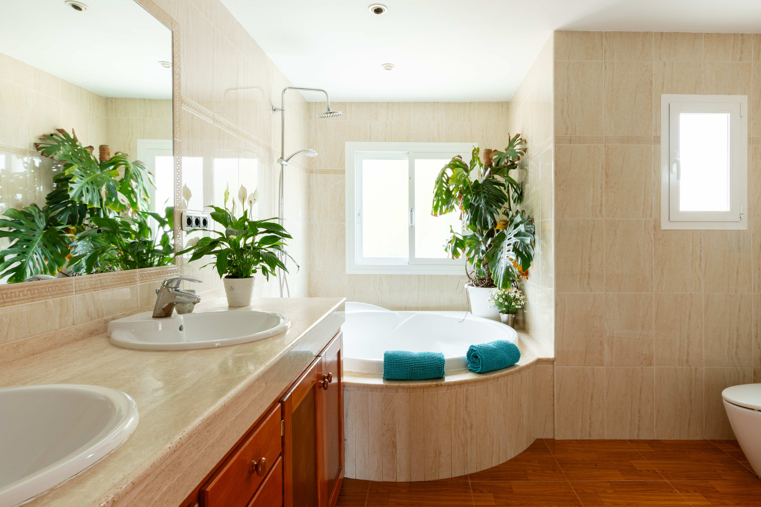 - Spacious bathroom with round bathtub